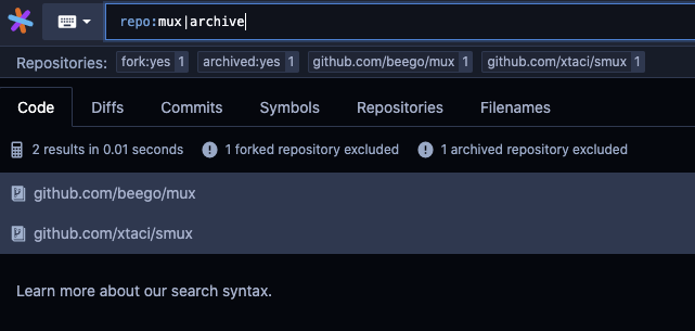 fork:onlyand thenarchived:only, and put those matching repos in the 'excluded' list. My intuition is that this is faster than callingGet(...)for each repo and then checking fork/archived. The additional DB calls run in the typical case whenfork/archivedunspecified, but not otherwise. -