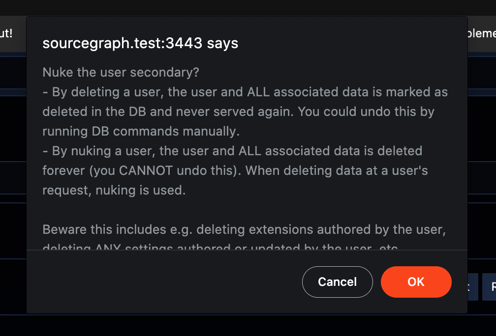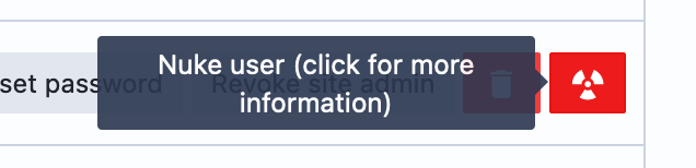 When the user clicks the either the "Delete user" or "Nuke user" button, they're presented with a browser alert to confirm: