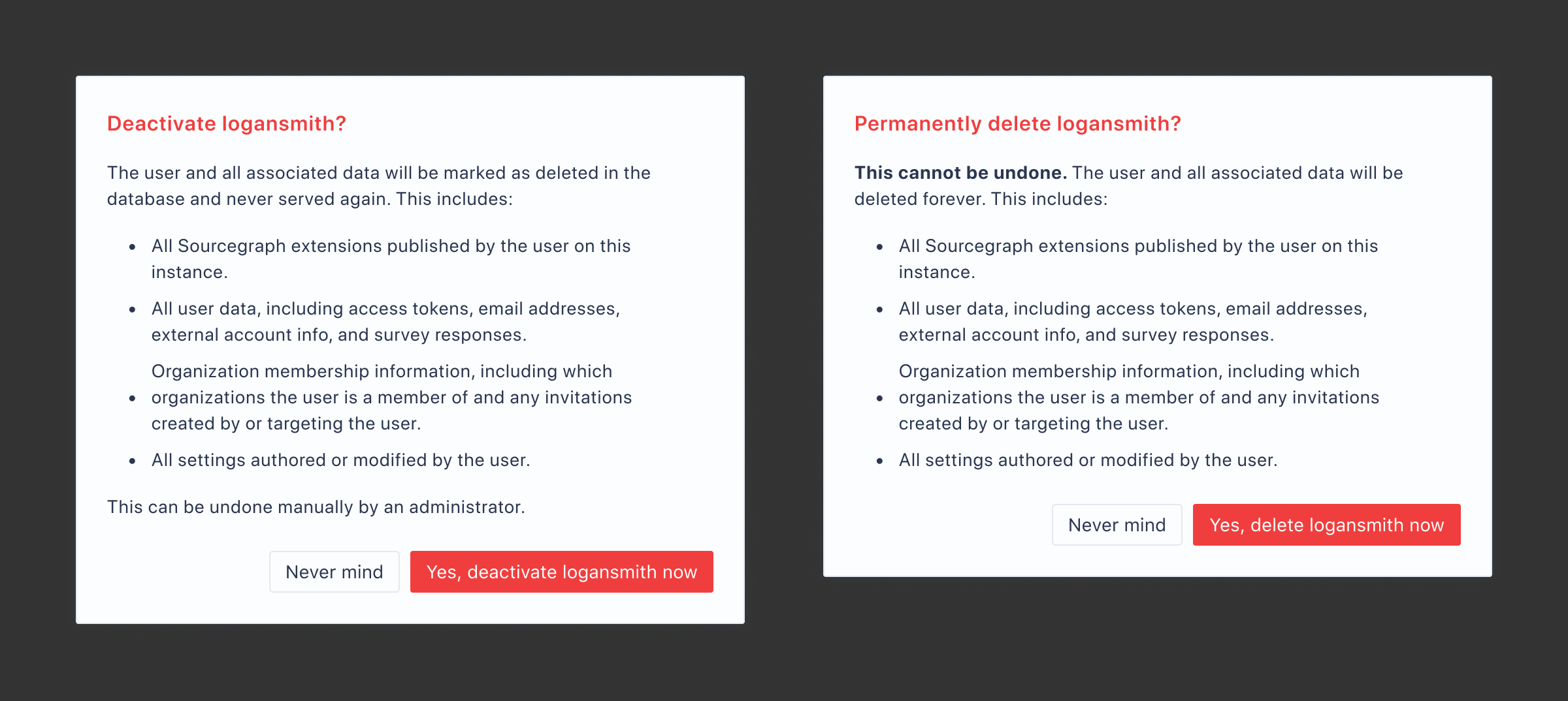 (Note: I understand that the implementation for soft delete almost certainly relies on a field like deleted_at or a deleted_users table, so renaming it to "Deactivate" can introduce incongruity, but this copy is user-facing while our database terminology is internal, so user-facing clarity wins out.)