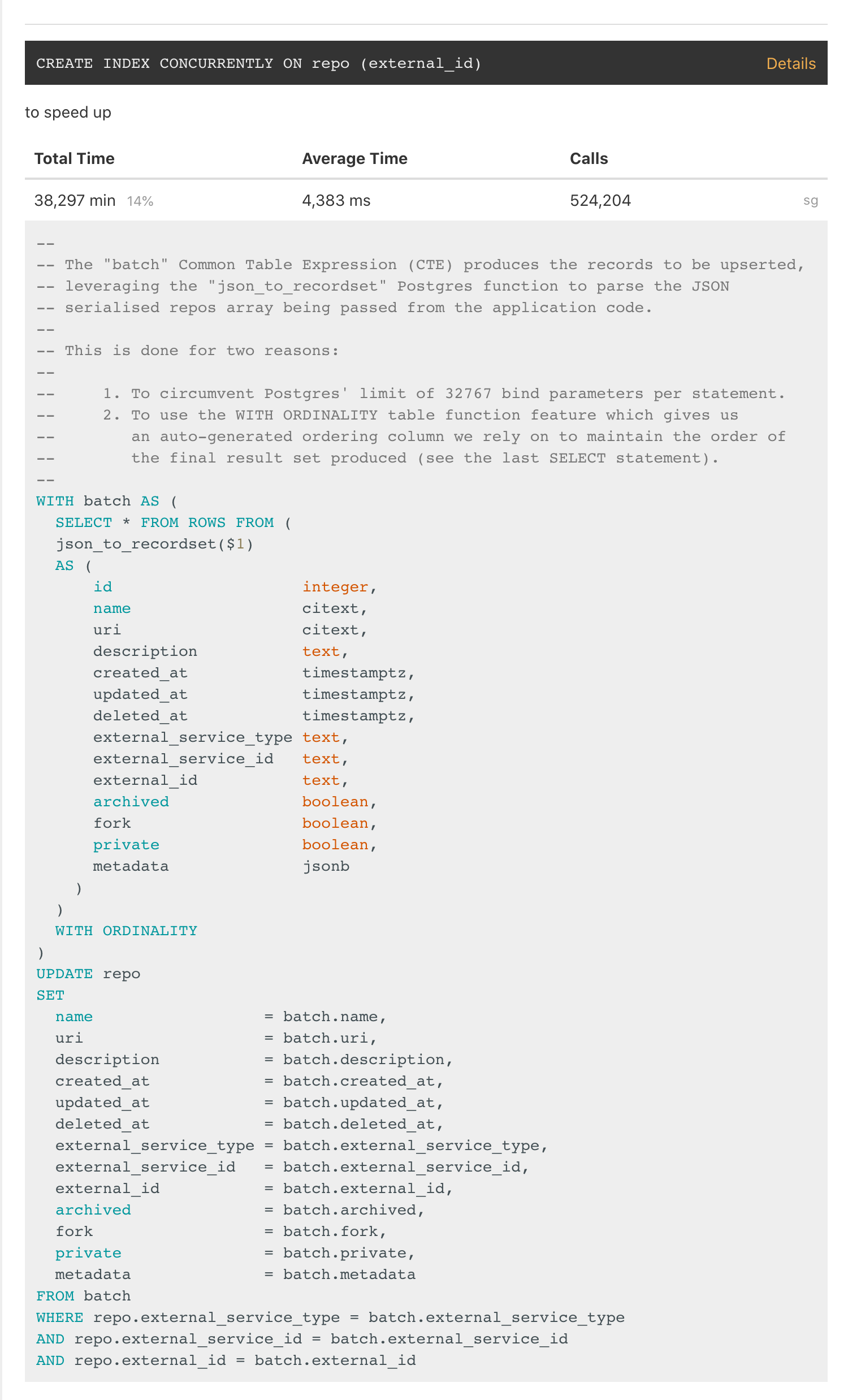 PgHero is showing this one of our slowest queries, it also suggests adding an index and we should investigate why this isn't covered by our existing unique index: "repo_external_unique_idx" UNIQUE, btree (external_service_type, external_service_id, external_id)