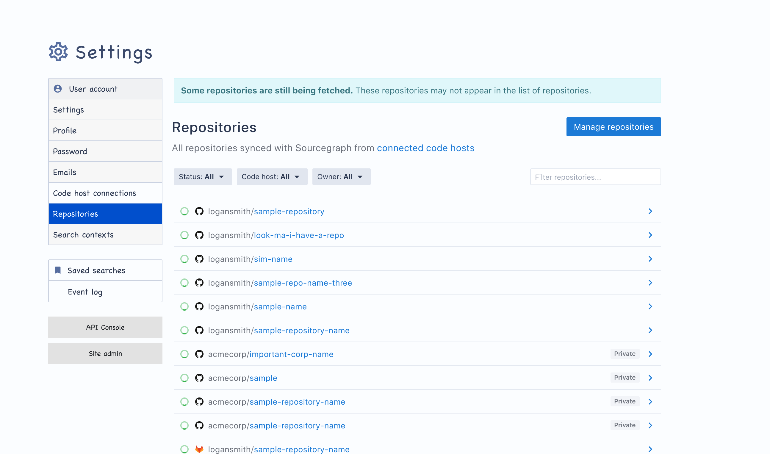 When the user finishes selecting repositories from the "Add/manage repositories" view, the current behaviour is to immediately redirect them to the "Repositories" view with the list of all repositories. When the user chooses to "Sync all repositories" the request is made asynchronously by our backend, because it may take a long time to fetch a list of all the repositories from the code hosts. The problem with this immediate redirect to the "Repositories" view is we may not have finished fetching the list of repositories yet, so they just get a blank screen.