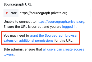 - If the extension doesn't have permissions to the Sourcegraph URL, it may fail to connect to the instance (#2228 (closed)).