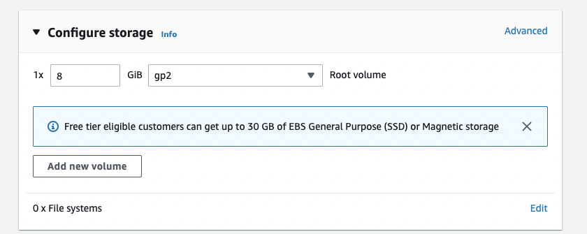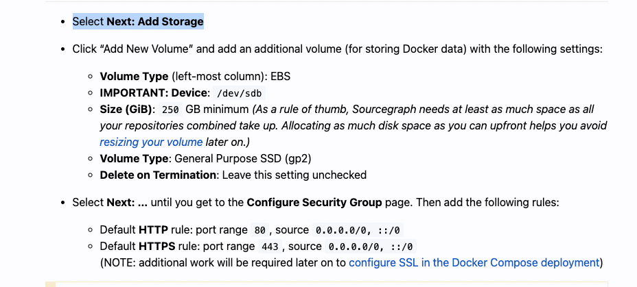 For example, in our docs we said Select Next: Add Storage but in the current AWS console the step has been moved to a single page under Configure storage: